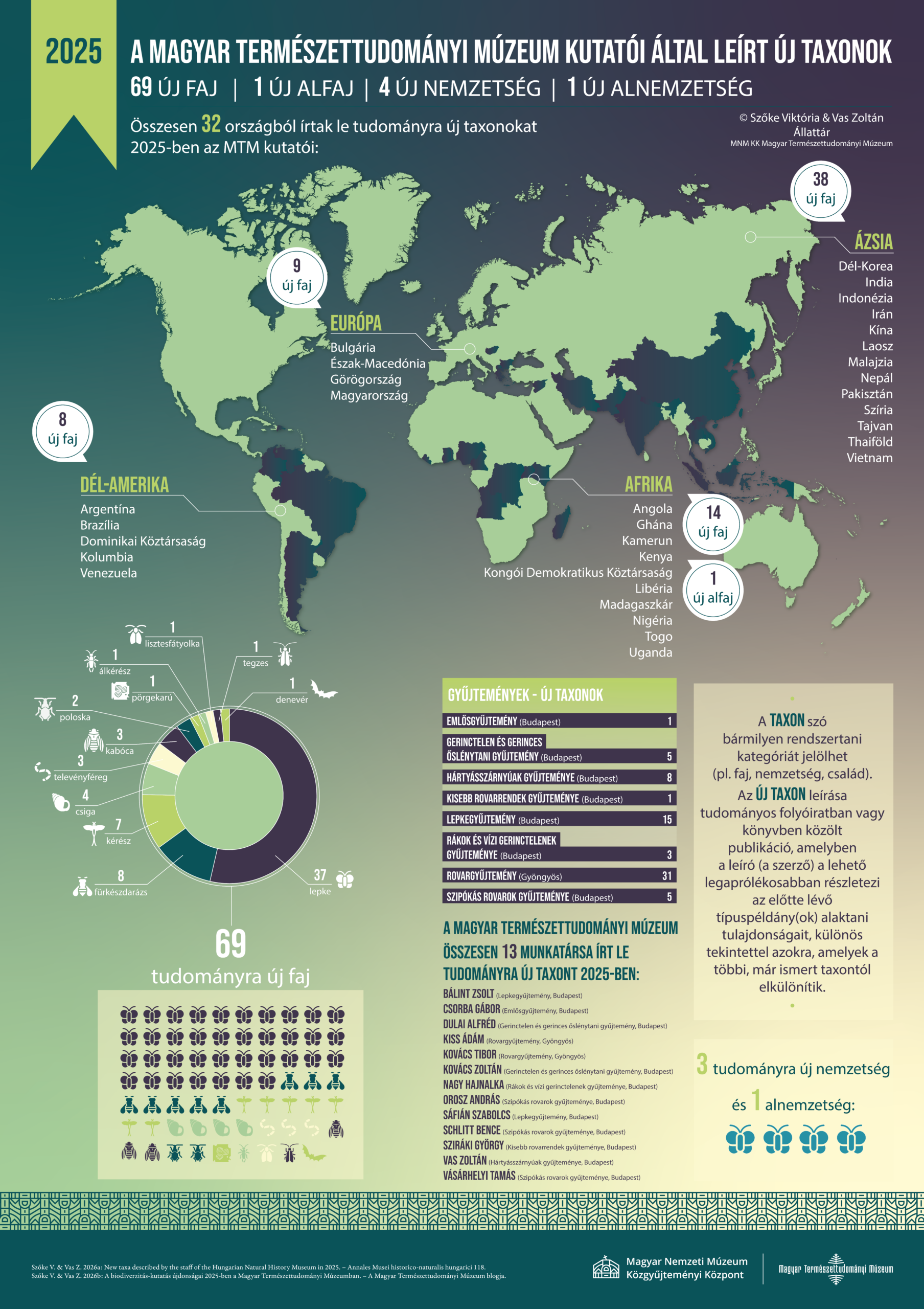 1. ábra. Összegző infografika az MTM-ben 2025-ben leírt, tudományra új taxonokról: összesen 32 országból 74 új taxont – úgymint 69 tudományra új fajt, egy alfajt, három nemzetséget és egy alnemzetséget – fedeztek fel, illetve írtak le a múzeum kutatói. Az új fajok földrajzi eloszlása szépen tükrözi a múzeum biodiverzitás-kutató tevékenységének a Kárpát-medence kutatása melletti hagyományos, esetenként már évszázados múltú erősségeit. Ahogy az utóbbi években is legjellemzőbb volt, Ázsiából való a legtöbb új leírás, ám Afrika zoológiai kutatása is erősen magán viseli a Magyar Természettudományi Múzeum szakembereinek névjegyét. Az Újvilág taxonómiai kutatásában magától értetődően kisebb a szerepünk, mint az Óvilágéban, de múzeumunk tudományos súlya az újvilági (különösen a neotropikus) fauna megismerésében tavaly is megmutatkozott.