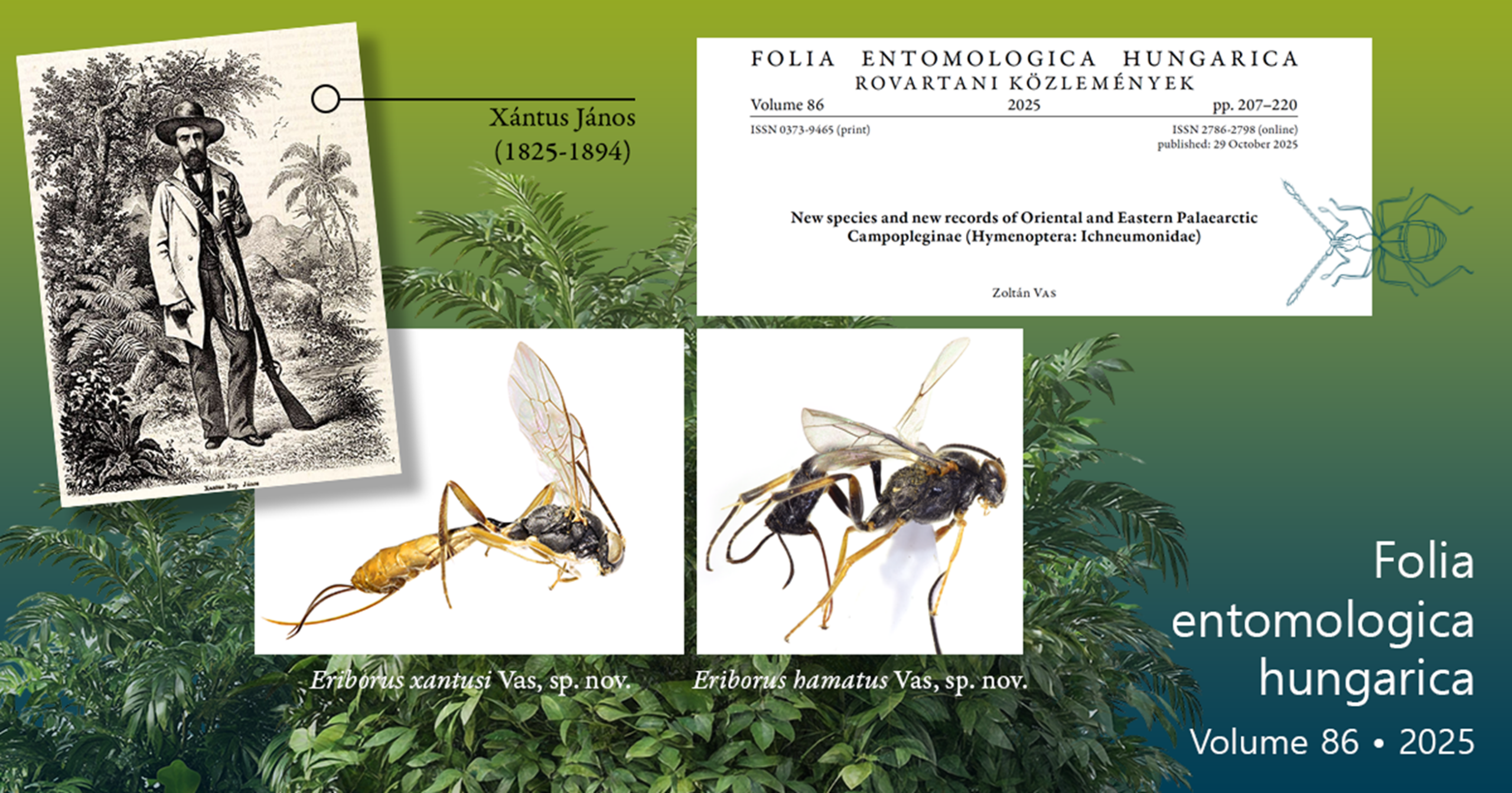 9. ábra. Új fürkészdarazsak: Xántus János (1825–1894) emlékének dedikálta a szerző a kép bal oldalán látható borneói fajt, megemlékezésül a kalandos életű zoológus, etnológus és gyűjtő születésének 200. évfordulójára (valamint egy további, Délkelet-Ázsiából leírt új faj látható a kép jobb oldalán). A cikket, amelyben a leírások megjelentek, a múzeum egyik tudományos folyóiratában olvashattuk – a kép pedig a lap Facebook oldalán hirdette a publikáció megjelenését